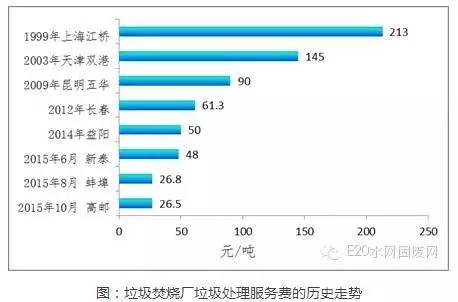 隨著中國城市化的加速,城市人口大幅增加,城市垃圾量也急劇增多,當(dāng)前,城市生活垃圾累積堆存量已達70億噸,而全國垃圾年產(chǎn)量仍以每年8%-10%的速度增長,與GDP增速匹敵,預(yù)計截止到2020年,城市垃圾產(chǎn)量將達約3.23億噸。垃圾焚燒發(fā)電是解決“垃圾圍城”的重要方式之一。由于在實施垃圾焚燒發(fā)電項目前期投資金額大,故一般采取PPP/BOT方式進行,項目投資回收主要依靠上網(wǎng)發(fā)電收入及垃圾處理服務(wù)費補貼收入。近16年來,垃圾處理的政府補貼費用呈現(xiàn)大幅下跌狀態(tài)(如下圖)。