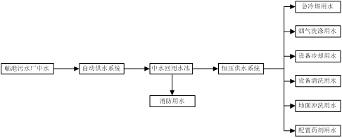因臨港污水廠的毗鄰企業(yè)——上海天漢環(huán)境資源有限公司地處供水網(wǎng)絡末端且其日常工業(yè)用水體量大,故經(jīng)雙方協(xié)商,臨港污水廠設置專用的中水泵房及輸送管線,將消毒后的最終出水作為中水供應給天漢環(huán)境,并通過在線儀表實時監(jiān)控中水中的COD、氨氮、總磷、總氮、pH值等水質指標,保障中水水質的穩(wěn)定達標;天漢環(huán)境對中水進行進一步的處理并用于消防、冷卻塔、煙氣洗滌、設備冷卻、設備清洗、地面沖洗和藥劑配置等用途。