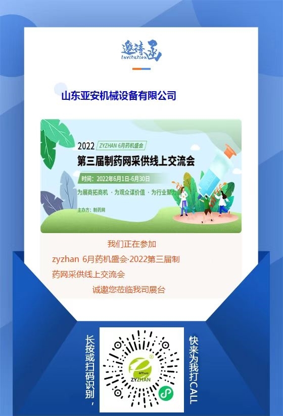 由制藥網(wǎng)舉辦的zyzhan 6月藥機(jī)盛會(huì)——2022第三屆制藥網(wǎng)采供線上交流會(huì)(在線展會(huì)),將于6月1日上午10:00正式拉開(kāi)帷幕。屆時(shí),山東亞安也將攜大批產(chǎn)品亮相展會(huì),敬請(qǐng)期待!