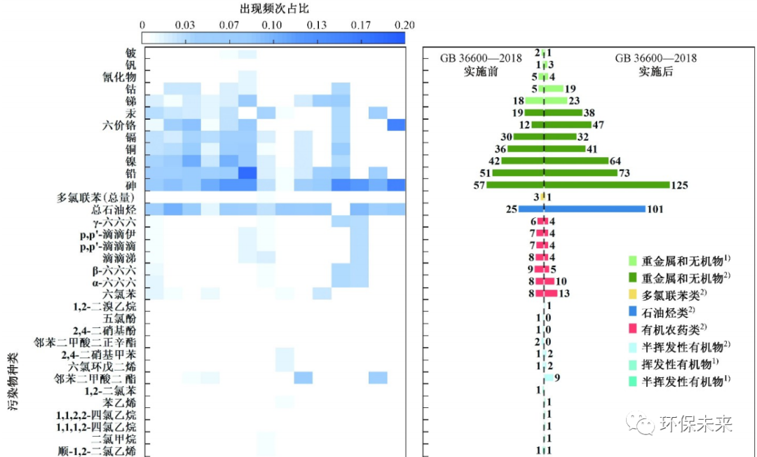 14 種行業(yè)企業(yè)特征污染物的出現(xiàn)頻次占比分布 (見(jiàn)圖 2) 顯示,在收集到的 537 個(gè)污染場(chǎng)地中,共出現(xiàn) 60 種污染物. 化學(xué)工業(yè)場(chǎng)地中特征污染物多樣,幾乎涵蓋了 60 種污染物中常見(jiàn)的污染物,包括苯系物、多環(huán)芳烴、重金屬、農(nóng)藥及石油烴等,這與已有研究結(jié)果[25-26] 一致. 金屬制品的主要污染物是 Ni、Cr6+、Cu、Cd、As 和 Pb 等重金屬,其中 Ni、Cr6+占比較大. 鋼鐵行業(yè)和金屬表面處理及熱處理加工場(chǎng)地涉及金屬熱處理、表面處理、機(jī)械加工等工藝,粉塵、煙塵等污染物的不當(dāng)處置導(dǎo)致 Pb、Cu、As、Zn 和 Ni 等重金屬的產(chǎn)生[27-28]. 黑色冶煉的主要污染物是苯并 [a] 芘和重金屬 As,有色冶煉的主要污染物是重金屬 As 和 Ni. 金屬冶煉和壓延加工業(yè)場(chǎng)地中,含 As 化合物和焦炭等在工藝過(guò)程中的使用,導(dǎo)致 As 和多環(huán)芳烴等污染物的產(chǎn)生[29-30]. 電器制造的主要污染物是重金屬 Pb;其余行業(yè)的特征污染物分布比較零散.同時(shí),在這 14 類行業(yè)中除造紙行業(yè)沒(méi)有統(tǒng)計(jì)到苯并 [a] 芘以外,其他行業(yè)均出現(xiàn)了多環(huán)芳烴類為主的半揮發(fā)性有機(jī)物,包括苯并 [a] 芘、二苯并 [a,h] 蒽、苯并 [b] 熒蒽、苯并 [a] 蒽、茚并 [1,2,3-cd] 芘和苯并[k] 熒蒽. 值得注意的是,重金屬污染物在不同行業(yè)的分布也很普遍,主要是 As、Pb、Ni、Cu、Cd 和 Cr6+,這與傳統(tǒng)的“五毒元素”相比,重金屬 Ni 替代了 Hg. 除此之外,苯系物為主的揮發(fā)性有機(jī)物和總石油烴類的污染物在不同行業(yè)中也有一定占比. 總之,在我國(guó)污染場(chǎng)地開(kāi)展修復(fù)與管控工作中,多環(huán)芳烴類為主的半揮發(fā)性有機(jī)物作為各行業(yè)中突出的污染物質(zhì),是我國(guó)未來(lái)場(chǎng)地土壤環(huán)境治理工作的重點(diǎn).2.3 場(chǎng)地污染物管控指標(biāo)的變化特點(diǎn)與大氣和水的污染防治工作相比,我國(guó)建設(shè)用地土壤污染防治工作正處于初步發(fā)展階段. 原國(guó)家環(huán)境保護(hù)總局于 2004 年發(fā)布了《關(guān)于切實(shí)做好企業(yè)搬遷過(guò)程中環(huán)境污染防治工作的通知》,標(biāo)志著我國(guó)工業(yè)污染場(chǎng)地環(huán)境管理的起步. 經(jīng)過(guò) 10 多年的探索和實(shí)踐,建設(shè)用地普適性的風(fēng)險(xiǎn)調(diào)查評(píng)估技術(shù)導(dǎo)則類標(biāo)準(zhǔn)和地方政府出臺(tái)的風(fēng)險(xiǎn)評(píng)估技術(shù)導(dǎo)則以及篩選值標(biāo)準(zhǔn)等相互補(bǔ)充,初步形成了包含場(chǎng)地調(diào)查、評(píng)估、修復(fù)管控與效果評(píng)估多環(huán)節(jié)的建設(shè)用地全過(guò)程土壤環(huán)境保護(hù)的標(biāo)準(zhǔn)體系. 在 GB 36600?2018 發(fā)布之前,各省份污染場(chǎng)地在進(jìn)行修復(fù)管控時(shí)主要參考HJ 350?2007《展覽會(huì)用地土壤環(huán)境質(zhì)量評(píng)價(jià)標(biāo)準(zhǔn)》和 DB 11/T 811?2011《場(chǎng)地土壤環(huán)境風(fēng)險(xiǎn)評(píng)價(jià)篩選值》等起步較早和先行的地方管理標(biāo)準(zhǔn)為主體的標(biāo)準(zhǔn)文本;在 GB 36600?2018 發(fā)布之后,各省份污染場(chǎng)地在進(jìn)行修復(fù)管控時(shí)則主要參考該標(biāo)準(zhǔn),并結(jié)合一些地方標(biāo)準(zhǔn)開(kāi)展場(chǎng)地管理工作. 這些標(biāo)準(zhǔn)中的篩選值和管制值提供了污染場(chǎng)地需要關(guān)注的污染物種類,明確了場(chǎng)地修復(fù)時(shí)污染物的管控指標(biāo),并將污染物清單區(qū)分為基本項(xiàng)目和其他項(xiàng)目,涵蓋了無(wú)機(jī)污染物、揮發(fā)性有機(jī)污染物、半揮發(fā)性有機(jī)污染物和農(nóng)藥/多氯聯(lián)苯及其他不同化學(xué)物質(zhì)等.GB 36600?2018 作為我國(guó)污染場(chǎng)地修復(fù)治理領(lǐng)域的重要管理標(biāo)準(zhǔn),其頒布實(shí)施以來(lái)發(fā)揮著越來(lái)越重要的作用. 為了分析該標(biāo)準(zhǔn)實(shí)施后工業(yè)污染場(chǎng)地污染物管控指標(biāo)的演變情況,以 GB 36600?2018 正式實(shí)施日期即 2018 年 8 月 1 日為分界線,嘗試分析GB 36600?2018 實(shí)施前后工業(yè)污染場(chǎng)地污染物管控指標(biāo)出現(xiàn)頻次的變化,并探討其變化規(guī)律. 由圖 2 可知,GB 36600?2018 實(shí)施后污染物管控指標(biāo)的出現(xiàn)頻次較 GB 36600?2018 頒布前總體增加,整體呈現(xiàn)左右不對(duì)稱的態(tài)勢(shì). 從絕對(duì)增量來(lái)看,出現(xiàn)頻次增加明顯的有苯并 [a] 芘、總石油烴、砷、二苯并 [a,h] 蒽、苯并 [b] 熒蒽、苯并 [a] 蒽、六價(jià)鉻等污染物,這與收集案例的年份和數(shù)量有關(guān). 從相對(duì)增量來(lái)看,出現(xiàn)頻次增加特別明顯的是溶劑類揮發(fā)性和半揮發(fā)性有機(jī)物,包括苯系物、多環(huán)芳烴和總石油烴等. 苯、甲苯、乙苯、二甲苯和苯乙烯等統(tǒng)稱為苯系物,具有持久性、親脂性和高毒性等特征,對(duì)人類健康和生態(tài)環(huán)境具有較強(qiáng)的毒性和危害性[31-33]. 同時(shí),部分多環(huán)芳烴作為光化學(xué)煙霧的重要前體物,其反應(yīng)活性較高,對(duì)霧霾天氣中細(xì)顆粒物的生成及其二次污染具有重要影響[34].總石油烴污染物遷移能力較強(qiáng),具有毒性