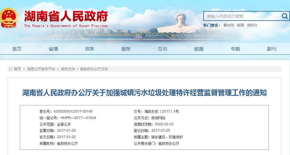 湖南省人民政府辦公廳關(guān)于加強(qiáng)城鎮(zhèn)污水垃圾處理特許經(jīng)營(yíng)監(jiān)督管理工作的通知