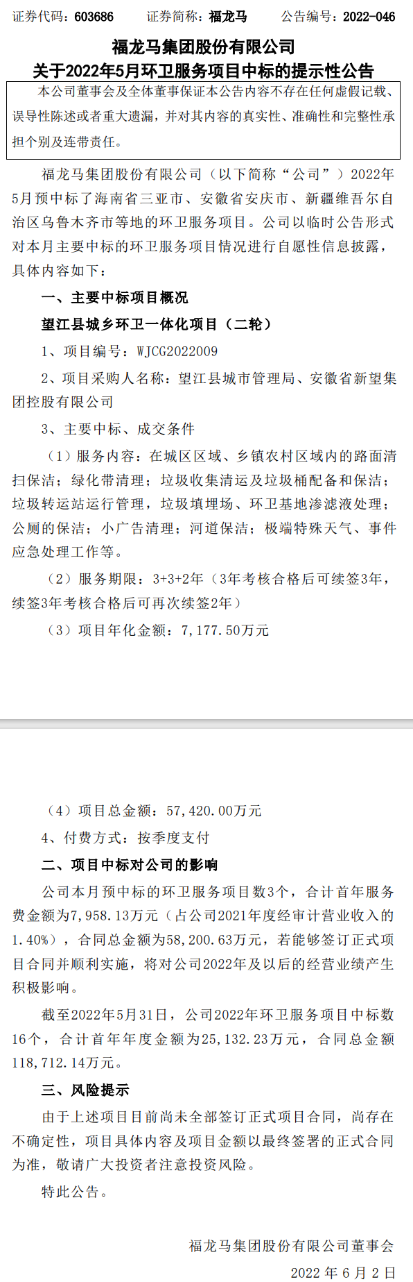 2022年6月2日,福龍馬集團股份有限公司(下稱“福龍馬”)發(fā)布“關(guān)于2022年5月環(huán)衛(wèi)服務(wù)項目中標的提示性公告”。