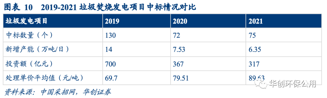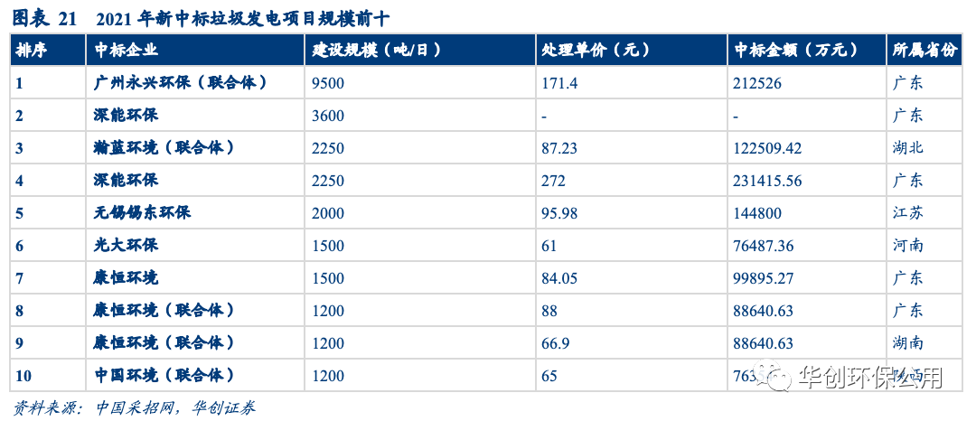 垃圾焚燒新訂單釋放速度減緩、處理費(fèi)價(jià)格提升。2021年垃圾焚燒新增體量進(jìn)一步下降,全年中標(biāo)項(xiàng)目總處理規(guī)模達(dá)6.35萬(wàn)噸/日,同比2020年下降15.67%。與此同時(shí),2021年平均中標(biāo)處理單價(jià)為89.63元/噸,同比2020 年增長(zhǎng)12.73%。近三年以來(lái)中標(biāo)價(jià)一直維持快速上升態(tài)勢(shì),疊加政策推動(dòng),我們認(rèn)為未來(lái)很可能按照“產(chǎn)生者付費(fèi)”原則,實(shí)施居民處理費(fèi),健全收費(fèi)機(jī)制,垃圾處理費(fèi)單價(jià)有望進(jìn)一步提升,降低對(duì)補(bǔ)貼依賴程度。