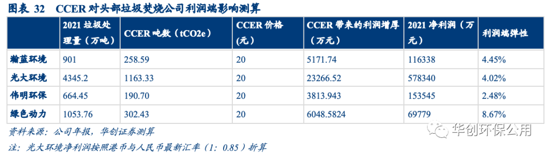 最理想情況下,CCER收入在利潤(rùn)端可為垃圾焚燒頭部企業(yè)帶來(lái)3%-9%的增厚。我們選取瀚藍(lán)環(huán)境、光大環(huán)境、偉明環(huán)保和綠色動(dòng)力四家頭部垃圾焚燒上市公司進(jìn)行測(cè)算,在假設(shè)公司所處理的垃圾全部可以轉(zhuǎn)化為CCER的情況下,按照2021年的垃圾處理量和凈利潤(rùn),CCER收入可分別為瀚藍(lán)環(huán)境、光大環(huán)境、偉明環(huán)保、綠色動(dòng)力帶來(lái)4.45%/4.02%/2.48%/8.67的利潤(rùn)端彈性。