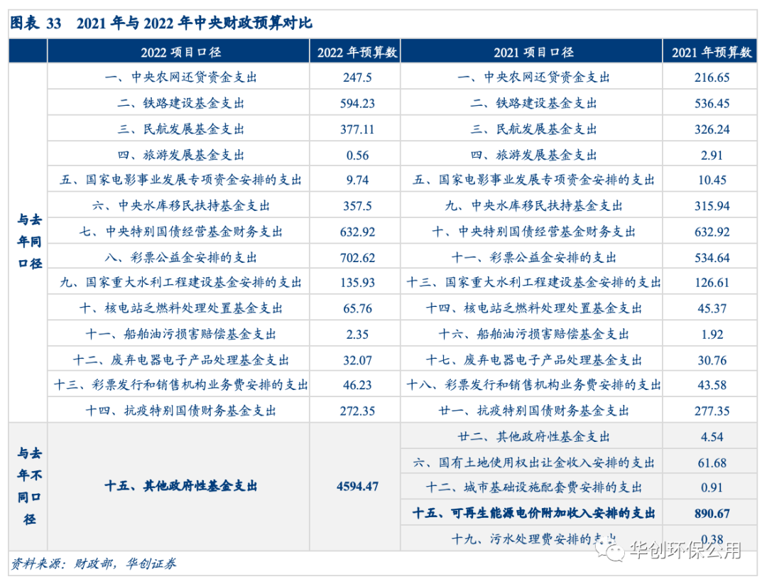 22年政府預(yù)算支出中有4500億元的補(bǔ)貼增量或?qū)⒂糜诳稍偕茉囱a(bǔ)貼的一次性發(fā)放。2022年與2021年中央財(cái)政預(yù)算支出的口徑發(fā)生了變化,其中21年出現(xiàn)的“可再生能源電價(jià)附加收入安排的支出”科目在22年的財(cái)政支出預(yù)算中消失,22年的統(tǒng)計(jì)口徑中其他政府性基金支出項(xiàng)目由21年的4.54億元驟增至4594.47億元??紤]到22年將21年的若干個(gè)口徑進(jìn)行合并,假設(shè)除可再生能源補(bǔ)貼項(xiàng)目的其他合并項(xiàng)目預(yù)算支出保持不變,預(yù)計(jì)今年將能騰挪出4500億元的財(cái)政支出供可再生能源補(bǔ)貼的發(fā)放,此前的拖欠問(wèn)題有望得到一次性解決。