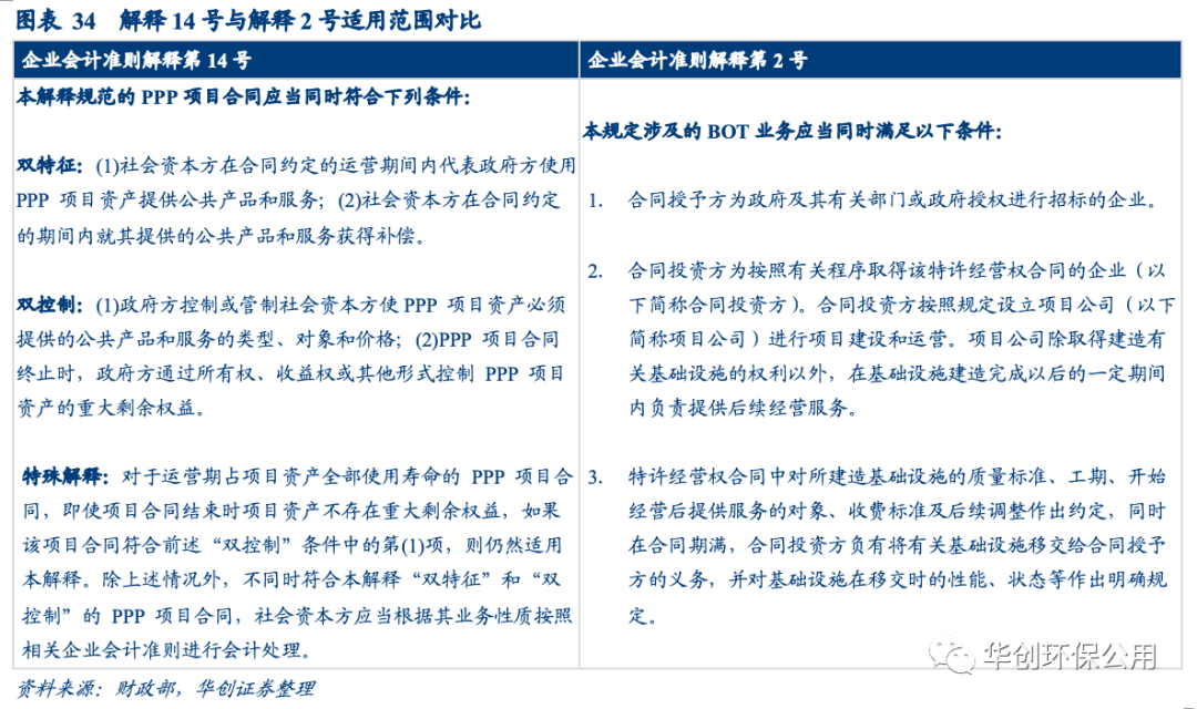 解釋14號(hào)對(duì)適用范圍做出了更詳細(xì)的說(shuō)明,應(yīng)當(dāng)符合“雙控制”與“雙特征”。解釋2號(hào)僅對(duì)“合同授予方”、“合同投資方”、“特許經(jīng)營(yíng)權(quán)”等關(guān)鍵名詞做出解釋而解釋14號(hào)則對(duì)適用范圍做出明確說(shuō)明——滿足“雙控制”與“雙特征”條件,并對(duì)運(yùn)營(yíng)期占項(xiàng)目資產(chǎn)全部使用壽命項(xiàng)目、不符合“雙控制”與“雙特征”條件項(xiàng)目的處理方法做出解釋。