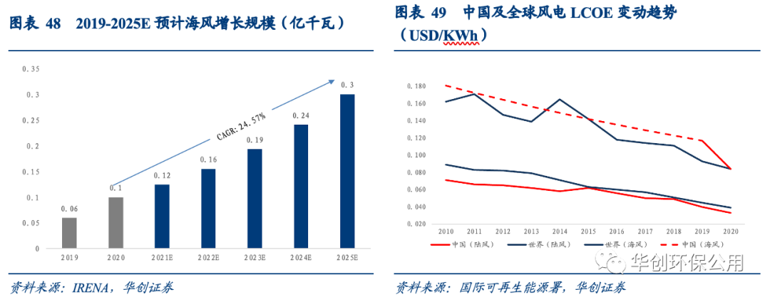 海上風(fēng)電增長(zhǎng)空間巨大,平價(jià)節(jié)點(diǎn)或?qū)⒂瓉?lái)裝機(jī)潮。海上風(fēng)電“十四五”期間預(yù)計(jì)新增裝機(jī)200GW,20-25年CAGR約25%,高于十四五期間風(fēng)電整體13.5%的增速。隨著海風(fēng)伙伴計(jì)劃首次提出海風(fēng)將于2024年實(shí)現(xiàn)平價(jià),海風(fēng)或?qū)⒂谄絻r(jià)節(jié)點(diǎn)迎來(lái)裝機(jī)潮,海風(fēng)未來(lái)發(fā)展可期。