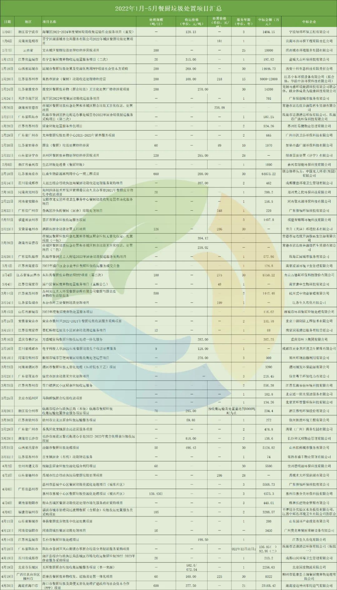 回到今年上半年的餐廚垃圾市場(chǎng),其具體情況到底怎么樣?據(jù)統(tǒng)計(jì),今年已釋放的71個(gè)餐廚垃圾項(xiàng)目中,僅有26個(gè)項(xiàng)目公布處理規(guī)模。按此計(jì)算,71個(gè)項(xiàng)目的合計(jì)處理規(guī)模大約為4092噸/日,預(yù)算投資額近23億元(2021年有54個(gè)項(xiàng)目公布處理規(guī)模,合計(jì)8257.5噸/日,平均單個(gè)項(xiàng)目為152.92噸/日)。▼2022年1月-5月餐廚垃圾處置項(xiàng)目匯總整體來(lái)看,今年上半年的餐廚垃圾市場(chǎng)呈現(xiàn)出3個(gè)特點(diǎn):?1、項(xiàng)目服務(wù)年限更加穩(wěn)定在項(xiàng)目服務(wù)年限上,相比去年也更加穩(wěn)定。去年部分餐廚項(xiàng)目存在服務(wù)期限僅半年、120天、甚至100天的情況,今年則最低年限為1年。其中,1-3年的項(xiàng)目還是占了主流,達(dá)到54個(gè)。?2、項(xiàng)目平均單價(jià)降低