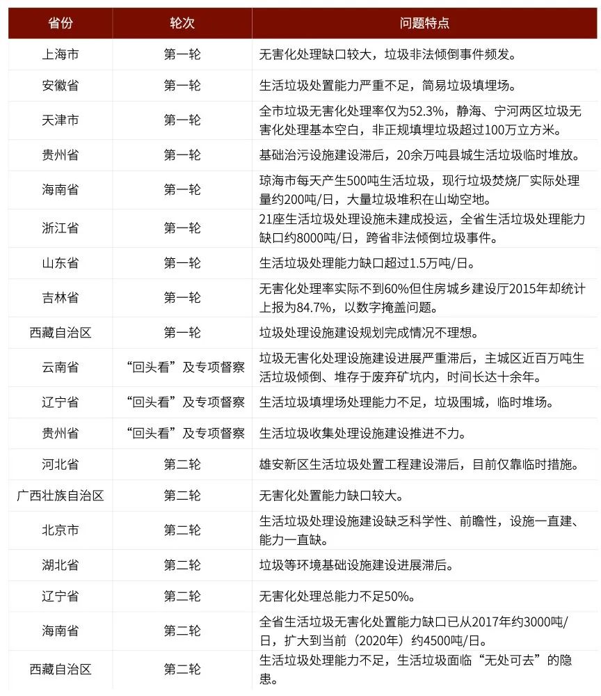 個別省區(qū)市歷史上無害化處理率低、無害化處理能力不足問題嚴重。其中,山東省在第一輪例行督察中被中央環(huán)保督察組反饋“生活垃圾處理能力缺口超過1.5萬噸/日”、云南省在“回頭看”及專項督察中被反饋“垃圾無害化處理設(shè)施建設(shè)進展嚴重滯后,主城區(qū)近百萬噸生活垃圾傾倒、堆存于廢棄礦坑內(nèi),時間長達十余年”、北京市第二輪例行督察被反饋“生活垃圾處理設(shè)施建設(shè)缺乏科學(xué)性、前瞻性,設(shè)施一直建、能力一直缺”等。具體情況詳見表1。