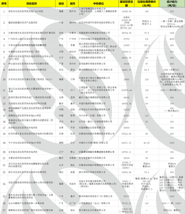 此外,27個(gè)項(xiàng)目中除長(zhǎng)春市擴(kuò)建項(xiàng)目、廣州市中心城區(qū)項(xiàng)目以及昆明空港二期等三個(gè)項(xiàng)目之外,其余項(xiàng)目幾乎都分布在縣級(jí)或三四線小城鎮(zhèn)。這一數(shù)據(jù)也印證了大中城市的市場(chǎng)已經(jīng)趨于飽和,縣域垃圾焚燒發(fā)電項(xiàng)目建設(shè)快速突起的趨勢(shì)。