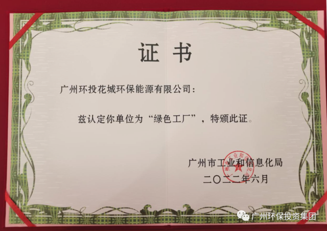2022年6月30日,廣州市工業(yè)和信息化局公布2021年廣州市綠色制造示范項目名單,廣州環(huán)投集團下屬環(huán)投花城公司榜上有名,獲得“綠色工廠”榮譽稱號。