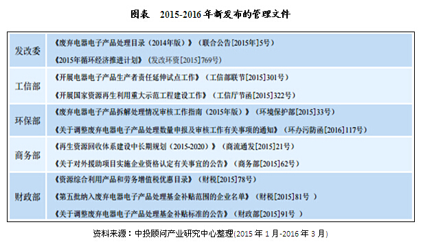 中投顧問發(fā)布的《2017-2021年中國電子廢棄物處理行業(yè)深度調(diào)研及投資前景預(yù)測報告》指出,我國廢棄電器電子產(chǎn)品回收處理的管理包括再生資源和環(huán)境保護兩個領(lǐng)域,涉及電器電子產(chǎn)品的綠色設(shè)計與制造、再制造、回收、處理和資源綜合利用和處置多個環(huán)節(jié)。從人大立法、國務(wù)院《廢棄電器電子產(chǎn)品回收處理管理條例》、到主管部委的管理辦法和規(guī)章、標(biāo)準(zhǔn),已經(jīng)形成一個至上而下的較為完善的管理體系。