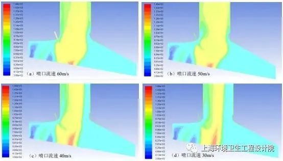 通過數(shù)值仿真技術,針對高熱值垃圾焚燒爐火焰中心溫度過高等問題,開發(fā)垃圾焚燒爐高溫低氧燃燒技術(ZL201610326967.8),最大程度實現(xiàn)燃燒均質化和溫度場均勻分布,有效緩解焚燒爐內的結焦情況。同時將NOx 的初始生成濃度控制在180mg/Nm3以內,遠低于普通焚燒爐300mg/Nm3。