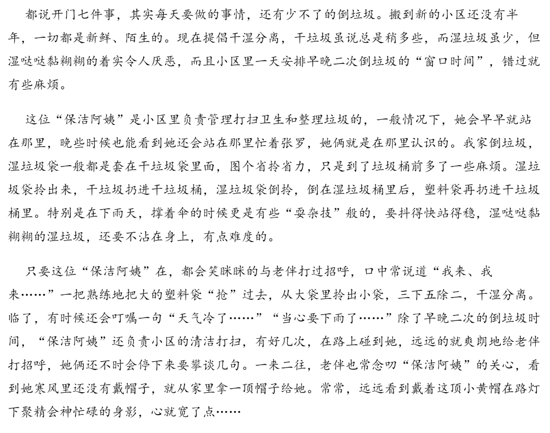 第三個付出,就是每天早晨七點到九點,晚上六點到八點要去定時去丟垃圾,這個時間雷打不動、刮風下雨、過年過節(jié)、再忙再累,也都要去。很多時候都已經(jīng)到07:50了,才夫妻兩個人急急忙忙拎著4袋垃圾出門去丟,然后呢,還看到很多人和我們一起拎著垃圾袋沖向垃圾箱。這也是很重要的一個時間付出吧。