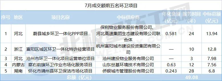 7月成交的環(huán)衛(wèi)項(xiàng)目相對(duì)較少,且只有5個(gè)項(xiàng)目成交額超過(guò)5億,前五名環(huán)衛(wèi)項(xiàng)目的成交額近50億,占成交總額的62.5%。