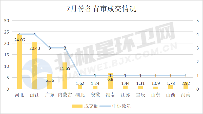 眾所周知,河北、浙江、廣東地區(qū)環(huán)衛(wèi)市場(chǎng)一直相當(dāng)火熱,7月也不例外,河北、浙江省均成交4個(gè)項(xiàng)目,成交額分別是24.06億元、20.43億元,榮獲冠、亞軍。