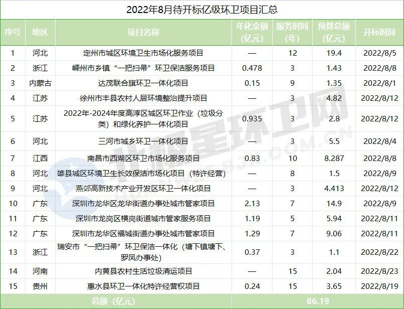 除此之外,北極星環(huán)衛(wèi)網(wǎng)還統(tǒng)計(jì)了8月待開(kāi)標(biāo)的億級(jí)環(huán)衛(wèi)項(xiàng)目,預(yù)算總額約86.2億元,主要分布在華北地區(qū)和東南地區(qū)。