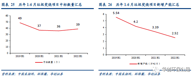 根據(jù)不完全統(tǒng)計,2022年1-6月全國垃圾焚燒發(fā)電項目開標(biāo)數(shù)量為39個,投資總額約為145.09億人民幣,新增產(chǎn)能2.52萬噸/日,垃圾處理單價平均值為91.18元/噸。盡管中標(biāo)項目數(shù)量較去年同期有所提升,但訂單的釋放省份多數(shù)位于中部地區(qū),日處理量超過1000噸僅6個(2021年同期為13個),故新增產(chǎn)能和投資額同比分別下滑25.66%和13.96%至2.52萬噸與145.09億元。但后補(bǔ)貼時代,新中標(biāo)的垃圾焚燒發(fā)電項目噸垃圾處置費(fèi)上浮明顯,較2021H1平均值84.04元/噸增長8.5%至91.18元。