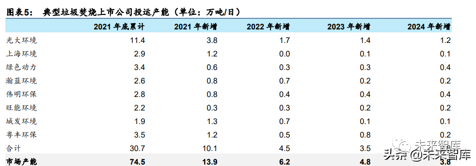 同時,我們選取光大環(huán)境等 8 家典型垃圾焚燒上市公司,根據(jù)我們對投產(chǎn)項目的統(tǒng)計和對 在建項目的投產(chǎn)進(jìn)度預(yù)測,8 家典型公司 2021-2024 年新增投運(yùn)產(chǎn)能合計 10.1/4.5/3.5/2.8 萬噸/日,2021 年垃圾焚燒市場新增投運(yùn)產(chǎn)能 13.9 萬噸/日。假設(shè) 2022-2024 年市場與典型 公司新增投運(yùn)產(chǎn)能之比維持 2021 年水平,測算得到 2022-2024 年市場新增投運(yùn)產(chǎn)能為 6.2/4.8/3.8 萬噸/日,與自上而下測算結(jié)果基本一致,從而驗證 2022-2024 年市場新增投運(yùn) 產(chǎn)能將明顯回落。