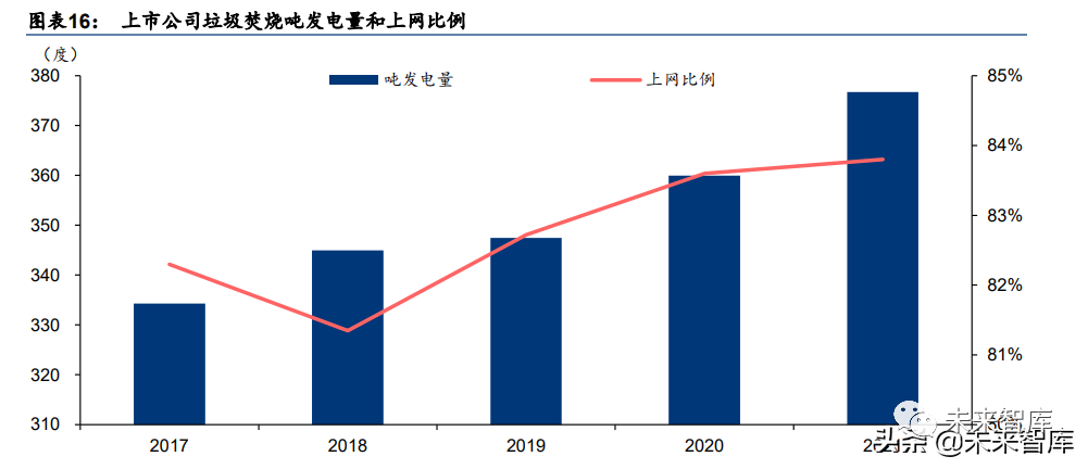 噸發(fā)電量與上網(wǎng)比率的雙重增長帶動噸上網(wǎng)電量顯著提升。將 8 家典型公司的噸發(fā)電量進(jìn) 行整理和計算,發(fā)現(xiàn) 2017-2021 年噸發(fā)電量由 334 度提升至 377 度,我們認(rèn)為主要有以下 兩方面原因:1)垃圾分類帶動入爐垃圾熱值水平上升。廚余垃圾含水量高,熱值較低,而 近年來垃圾分類在全國范圍內(nèi)的推廣,使廚余垃圾與生活垃圾相分離,導(dǎo)致入爐焚燒的廚 余垃圾占比減少;2)爐排爐技術(shù)進(jìn)一步推廣。2016 年全國垃圾焚燒廠中,使用爐排爐技 術(shù)的焚燒爐占比為 78%,2020 年占比已經(jīng)提升至 85%以上,相比于流化床技術(shù),爐排爐 技術(shù)能使垃圾燃燒的更加充分,從而提升噸發(fā)電量,我們預(yù)計 2022-2025 年噸發(fā)電量為 379/381/383/385 度。另外,隨著行業(yè)整體運(yùn)營水平上升,各企業(yè)致力于生產(chǎn)環(huán)節(jié)節(jié)能降耗, 降低廠用電率,行業(yè)整體上網(wǎng)比率也持續(xù)增長,2018-2021 年間由 81.3%增長至 83.8%, 我們預(yù)計 2022-2025 年上網(wǎng)比例逐年提升 0.2 個百分點(diǎn)至 84.6%。以上雙重因素帶動噸上 網(wǎng)電量顯著提升。