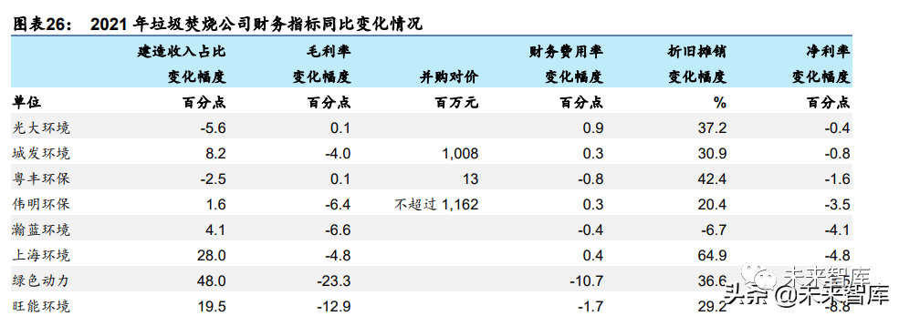 財務(wù)費(fèi)用和折舊攤銷影響下,產(chǎn)能增長有望穩(wěn)定盈利水平。2021 年偉明環(huán)保和城發(fā)環(huán)境均 實施了較大規(guī)模的并購,并購交易對價分別為不超過 11.62/10.08 億元,其財務(wù)費(fèi)用率同比 均有小幅提升,我們認(rèn)為,并購在短期會帶來財務(wù)費(fèi)用增長,但投運(yùn)產(chǎn)能的不斷增加將提 供穩(wěn)健現(xiàn)金流,改善公司財務(wù)結(jié)構(gòu),有望消除財務(wù)費(fèi)用增加的短期影響。綠色動力由于首 次確認(rèn)建造收入和固廢業(yè)務(wù)增長,2021 年營業(yè)收入同比+122%,因此財務(wù)費(fèi)用率下降 10.7pp。新增投運(yùn)產(chǎn)能帶來折舊攤銷上漲,項目投運(yùn)初期產(chǎn)能利用率較低,盈利能力相對 較低,我們認(rèn)為,投運(yùn)項目產(chǎn)能度過爬坡期之后,盈利能力可達(dá)到穩(wěn)定狀態(tài)。