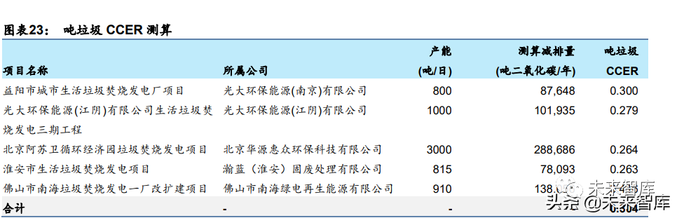CCER 項目在傳統(tǒng)項目盈利模式基礎(chǔ)上帶來附加收入,增厚利潤空間。垃圾焚燒發(fā)電項目 主要在以下兩個方面實現(xiàn)了碳減排:(1)焚燒替代填埋,減少了因填埋產(chǎn)生的甲烷。(2) 焚燒發(fā)電替代火力發(fā)電,生產(chǎn)相同電量下的碳排放量相對更少。選取中國自愿減排交易信 息平臺上披露減排量的垃圾焚燒項目,可以計算出每噸垃圾產(chǎn)出的 CCER 約為 0.3 噸,同 時根據(jù)復(fù)旦大學(xué)可持續(xù)發(fā)展研究中心的數(shù)據(jù),目前 CCER 的買入價格預(yù)期約為 60 元/噸, 對應(yīng)每噸垃圾可帶來的增量收入約為 18 元。噸垃圾處置費(fèi)取 2021 年行業(yè)平均值 87.9 元/ 噸,噸垃圾上網(wǎng)電量取 2021 年上市公司平均數(shù)據(jù)進(jìn)行測算,CCER 在收入/利潤端可為項 目帶來約 6.4%/28.7%的增厚空間。在國補(bǔ)減少 30%情況下,CCER 在收入/利潤端仍可帶 來 1.9%/8.6%的增厚空間。
