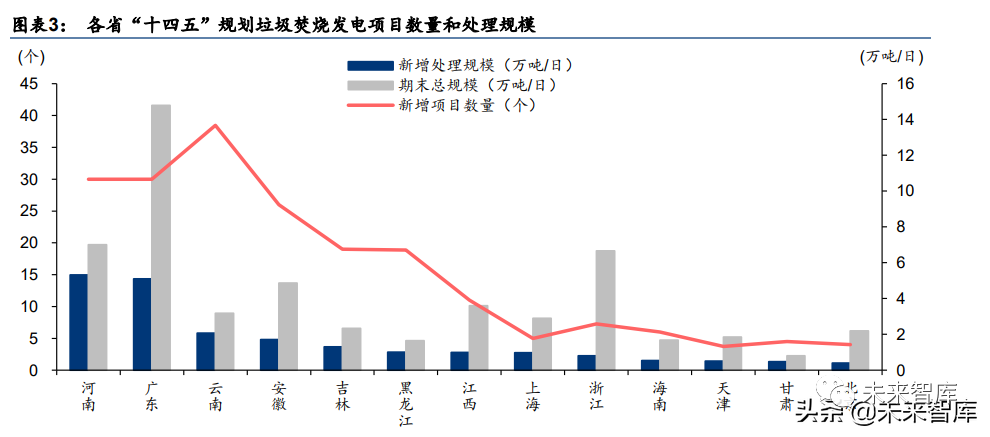 “十四五”規(guī)劃提出,到 2025 年底,全國城鎮(zhèn)生活垃圾焚燒處理能力達(dá)到 80 萬噸/日左右, 相對“十三五”末期增量空間為 22 萬噸/日;城市生活垃圾焚燒處理能力占比 65%左右,相對 “十三五”末期提升空間仍有 20 個百分點(diǎn)。此外 13 個?。▍^(qū)、市)相繼發(fā)布涉及生活垃圾焚 燒發(fā)電的“十四五”規(guī)劃,結(jié)合國家統(tǒng)計局公布的 2020 年生活垃圾焚燒發(fā)電產(chǎn)能數(shù)據(jù),我 們測算得到“十四五”期間 13 個省(區(qū)、市)規(guī)劃新增垃圾焚燒項目 204 個,新增產(chǎn)能 21.2 萬噸/日,其中,規(guī)劃新增處理規(guī)模前二的?。▍^(qū)、市)為河南和廣東,分別為 5.3/5.1 萬噸/日,對應(yīng)規(guī)劃新增項目數(shù)量均為 30 個。
