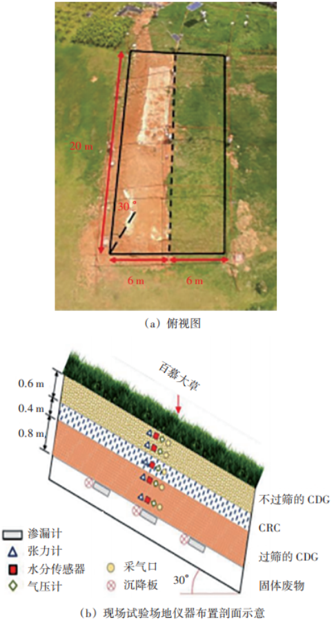 圖9 深圳下坪垃圾填埋場現場試驗場俯視圖及現場試驗場地儀器布置剖面示意