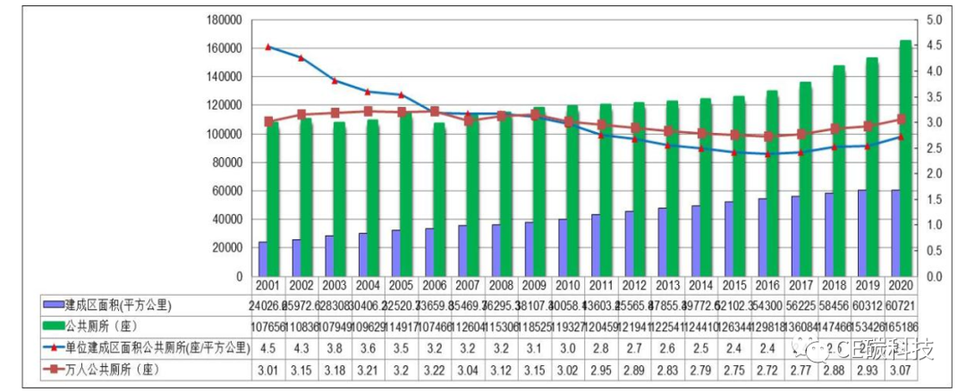 2020年,我國公共廁所配置數(shù)量為每萬人3.07座,單位建成區(qū)面積2.7座/平方公里。上述數(shù)據(jù)均包含附屬式公共廁所,若不考慮附屬式公廁,我國公廁配置則很難達到標準要求。