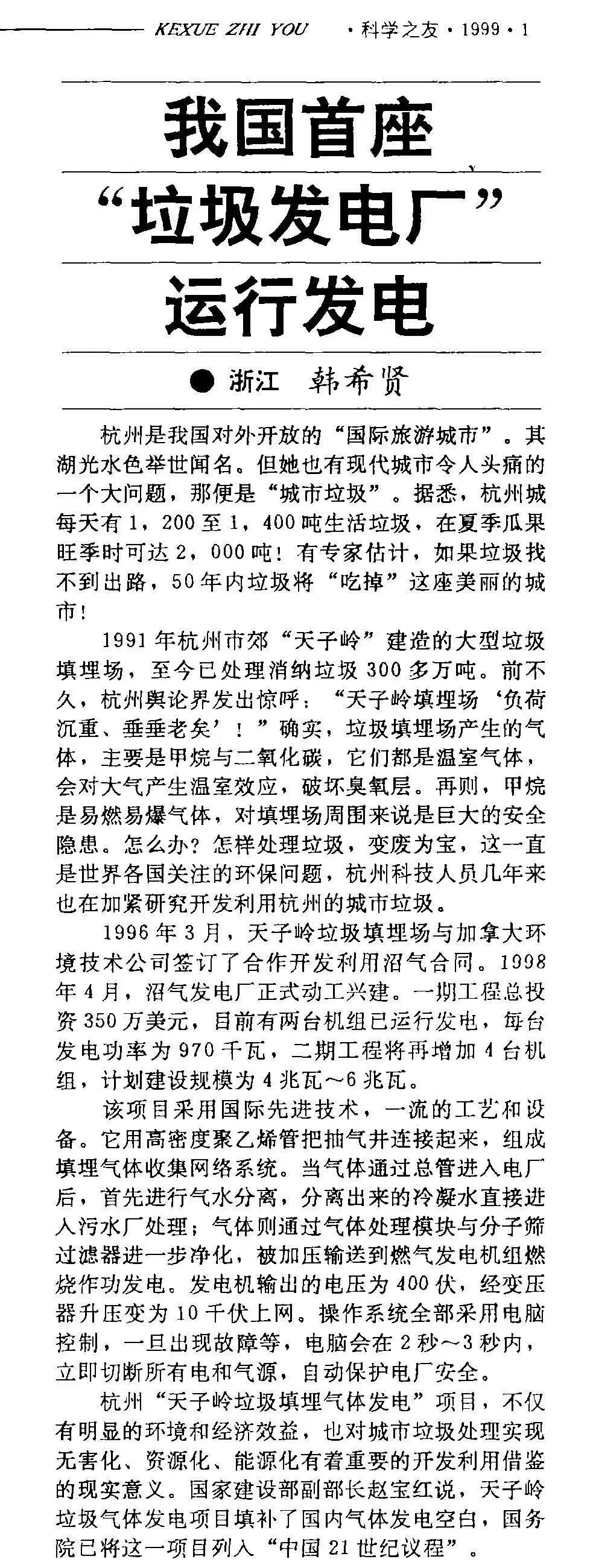 報道原文表示,杭州“天子嶺垃圾填埋氣體發(fā)電”項目不僅有明顯的環(huán)境和經(jīng)濟效益,也對城市垃圾處理實現(xiàn)無害化、資源化、能源化有著重要的開發(fā)利用借鑒的現(xiàn)實意義。時任原建設(shè)部副部長的趙寶紅說,天子嶺垃圾氣體發(fā)電項目填補了國內(nèi)氣體發(fā)電空白,國務(wù)院已將這一項目列入“中國21世紀(jì)議程”。