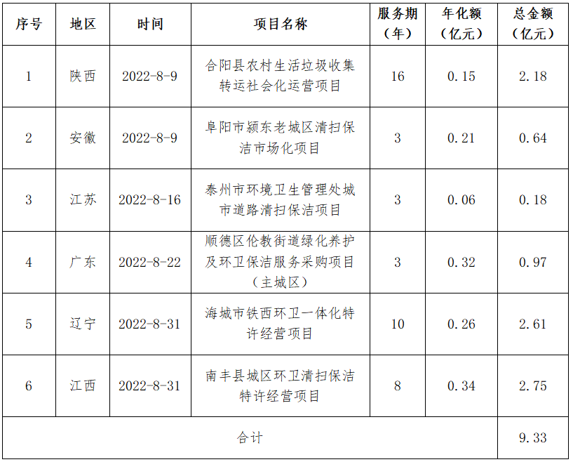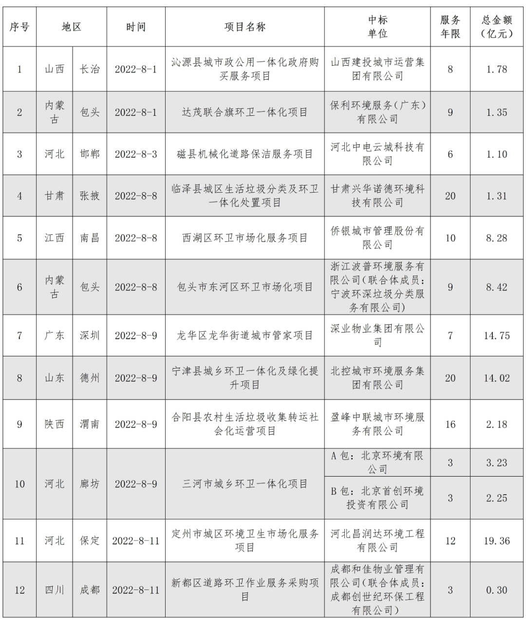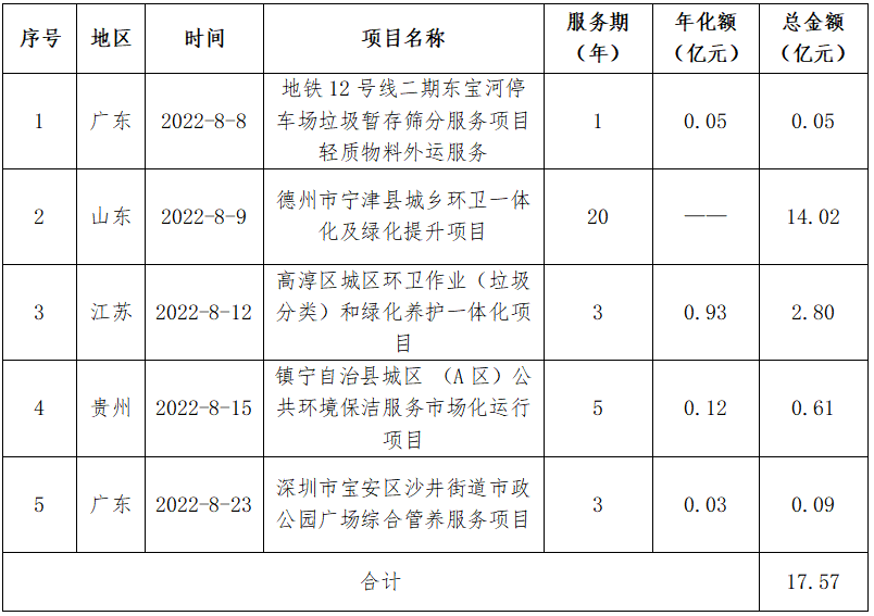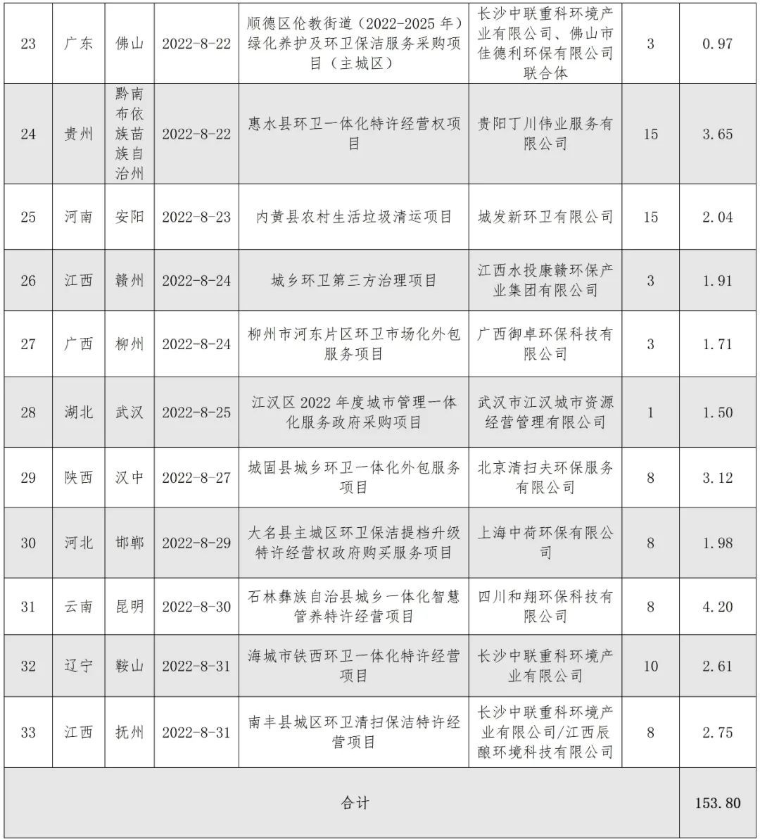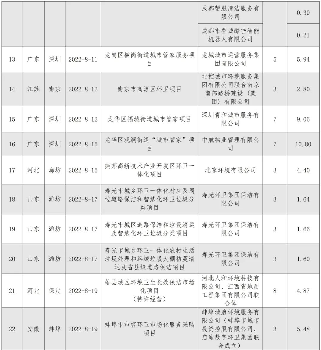 其中最典型的就是山東省德州市寧津縣城鄉(xiāng)環(huán)衛(wèi)一體化及綠化提升項目,該項目服務(wù)期為20年,第一至第二年合同額預(yù)估為5682萬元,第三至二十年合同額預(yù)估為13.4514億元,合計金額14.0196億元。項目服務(wù)范圍包括但不限于寧津縣10座鄉(xiāng)鎮(zhèn)垃圾轉(zhuǎn)運站的升級改造以及新建鄉(xiāng)鎮(zhèn)生活垃圾分類處理項目,鄉(xiāng)鎮(zhèn)駐地及國省干道綠化提升工程以及縣城綠化提升工程(包括福寧河公園提升改造、道路綠化及小游園提升改造、康寧湖提升改造工程)及其他環(huán)衛(wèi)服務(wù)。據(jù)環(huán)衛(wèi)科技網(wǎng)粗略統(tǒng)計,北控城市環(huán)境今年已中標近20個環(huán)衛(wèi)項目,合計中標金額超過48億元。在年度排行榜上,目前僅次于盈峰環(huán)境和僑銀股份,排在第三的位置。進入2022年,盈峰環(huán)境和僑銀股份兩家環(huán)衛(wèi)龍頭企業(yè)延續(xù)了以往的強勢,幾乎每個月度排行都榜上有名。8月,盈峰環(huán)境和僑銀股份再次上榜,分別排在第5和第7的位置。盈峰環(huán)境當(dāng)月中標6個環(huán)衛(wèi)項目,尤其在最后一天同時拿下遼寧省海城市鐵西環(huán)衛(wèi)一體化和江西省南豐縣城區(qū)環(huán)衛(wèi)清掃保潔兩個特許經(jīng)營項目,南北“雙響”收獲5.36億元。表3 盈峰環(huán)境8月中標項目匯總