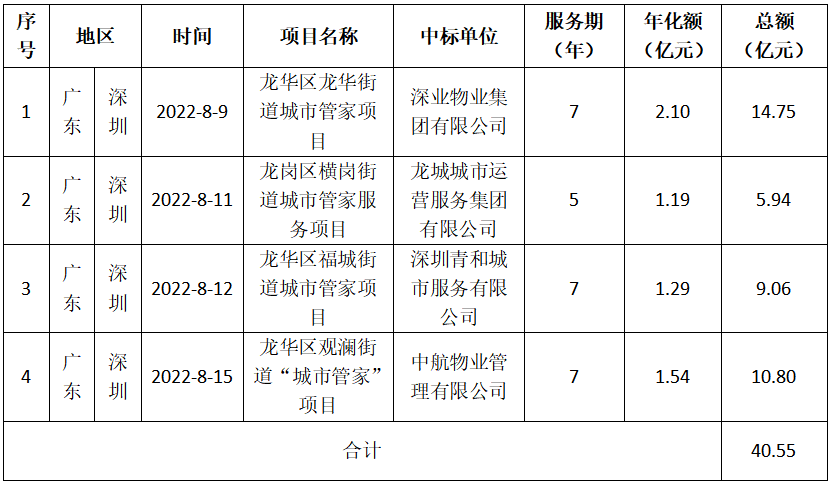 據(jù)環(huán)衛(wèi)科技網(wǎng)粗略統(tǒng)計,今年盈峰環(huán)境已中標50余個環(huán)衛(wèi)項目,總金額突破70億元;僑銀股份則中標了40余個環(huán)衛(wèi)項目,總金額超過67億元。前8個月二者你追我趕,輪番登頂年度排行榜。● 深圳批量生產(chǎn)“城市管家”,多家企業(yè)借機登榜8月,深圳又扎堆釋放了一批“城市管家”項目。這些項目體量大、服務(wù)周期長、金額高,服務(wù)內(nèi)容涉及垃圾清運和清掃保潔(含城市家具保潔)、綠化管養(yǎng)、市政公廁管養(yǎng)、非市政道路路燈管養(yǎng)、市容巡查服務(wù)、節(jié)日燈籠國旗等裝飾物懸掛、“四害”消殺、垃圾分類和減量服務(wù)等多維度領(lǐng)域。深業(yè)物業(yè)、中航物業(yè)和青和城服都憑借斬獲“城市管家”項目登上月度榜單。
