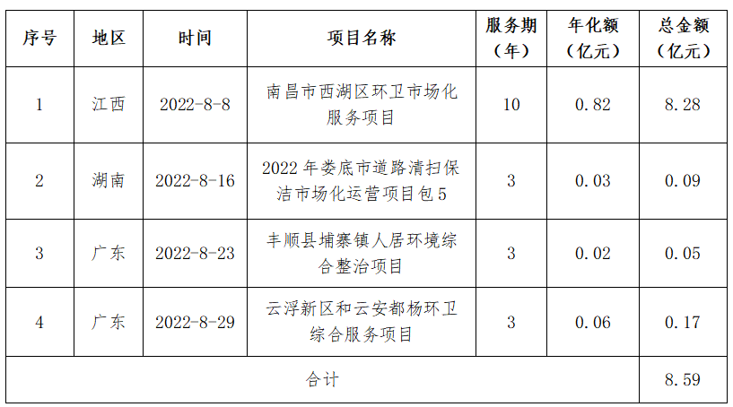 僑銀股份當(dāng)月則中標4個環(huán)衛(wèi)項目,其中南昌市西湖區(qū)環(huán)衛(wèi)市場化服務(wù)項目,服務(wù)期10年,總金額達到8.28億元。表4 僑銀股份8月中標項目匯總