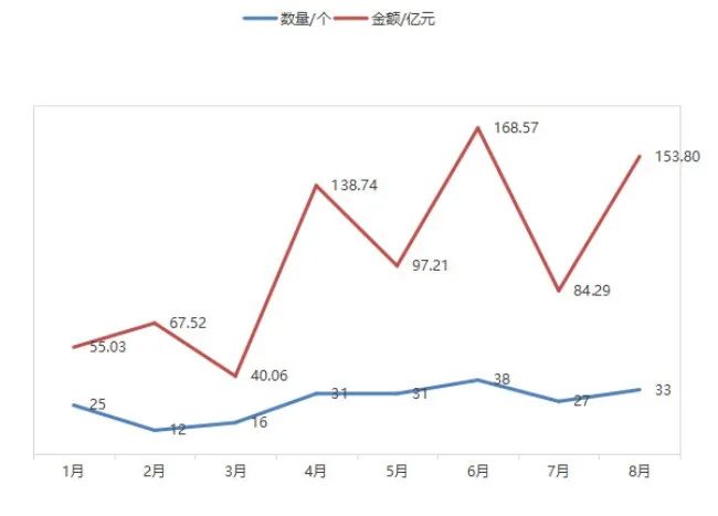 據(jù)環(huán)衛(wèi)科技網(wǎng)統(tǒng)計,8月,全國共開標了33個億級環(huán)衛(wèi)項目,合計中標金額153.80億元。當(dāng)月億級環(huán)衛(wèi)項目開標數(shù)量和金額僅次于6月份,是今年第二高的月份。