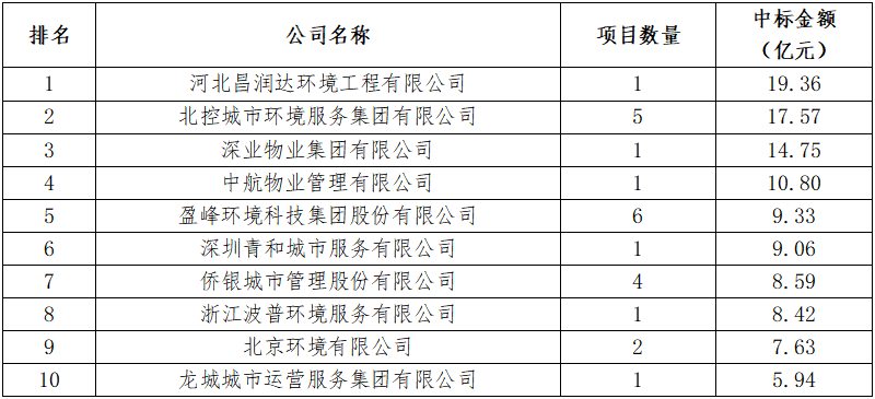 8月,竟有6企業(yè)憑中標1項目進入前十,其中昌潤達、深業(yè)物業(yè)更是憑1項目而排名前三。8月份企業(yè)排名如表1所示。表1 8月環(huán)衛(wèi)項目中標企業(yè)排行榜