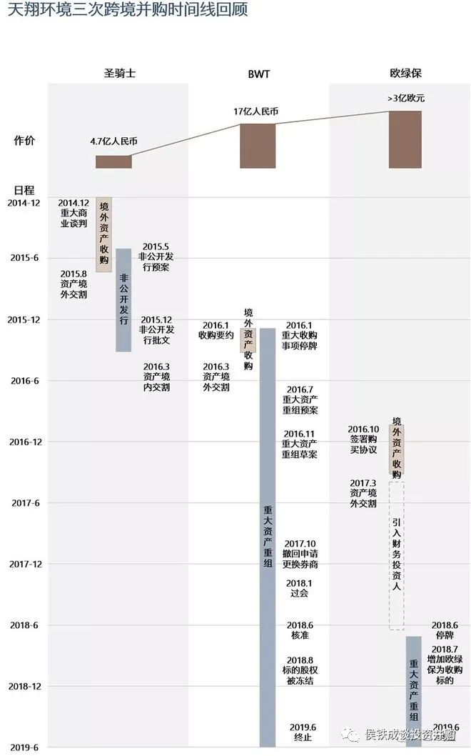 原本的十大并購案例,寫著寫著寫成了十大環(huán)保并購慘案。為了緩解大家失落悵惘的心情,免費奉上一個跌到谷底的案子,大家再忍一忍,黎明前的黑暗。本文為環(huán)保十大并購案例之五,天翔環(huán)境海外收購圣騎士、BWT、歐綠保,最終公司破產(chǎn)退市。我們之前看的幾個并購失敗案例,雖然也都是十年苦心經(jīng)營,毀于一旦,但大部分只是元氣大傷,主營業(yè)務(wù)利潤虧光,大股東黯然離場而已。今天的案例,并購的后果是上市公司破產(chǎn)退市,大股東債務(wù)纏身被檢查機關(guān)起訴,員工債權(quán)人均蒙受巨大損失。里里外外大幾十億的虧損,堪稱“環(huán)保上市公司十年內(nèi)最大的慘案”。歡迎大家多提寶貴意見。尋找底層規(guī)律,帶動行業(yè)發(fā)展,避免低級錯誤重現(xiàn)。幾經(jīng)掙扎的天翔環(huán)境最終還是在2021年8月30日迎來了被深交所摘牌的結(jié)局。天翔環(huán)境原名天保重裝,原主業(yè)為大型節(jié)能環(huán)保及清潔能源設(shè)備,具體包括分離機械系列設(shè)備和水輪發(fā)電機組設(shè)備,并于2014年完成上市。當時,天翔環(huán)境的主營已露疲態(tài),上市當年收入下滑超過30%,公司開始尋找轉(zhuǎn)型方向。2015年開始,天翔環(huán)境通過連續(xù)的大手筆并購進軍環(huán)保領(lǐng)域,先后以4.7億收購美國的污泥處理設(shè)備公司圣騎士、17億收購德國的水處理公司BWT,并在隨后迎來了自己的高光時刻,2016年底,其市值來到了107.5億的歷史最高值。好景不長,因為體外并購未能裝入上市公司,導(dǎo)致了一系列問題,悲劇大幕就此拉開。2018年,天翔環(huán)境在年報中披露,控股股東直接控制的成都親華科技有限公司非經(jīng)營性資金占用24.55億,而當時天翔環(huán)境本身的債務(wù)逾期金額已達到17.58億。從此,天翔環(huán)境股價持續(xù)下跌,直至2021年8月30日最終被深交所摘牌。回顧天翔環(huán)境的發(fā)展歷程,核心是三次海外收購,分別是2014年12月收購的美國圣騎士,2016年1月收購的BWT公司,2016年10月收購的歐綠保,交易金額預(yù)期超過3億歐元。其中第一個交易順利完成,后面兩個交易只完成了體外收購,并沒有完成裝入上市公司的動作,最終也導(dǎo)致了上市公司與大股東的相繼崩盤。第一筆收購,公司與券商聯(lián)合成立基金,收購標的公司。然后上市公司非定向增發(fā),募集資金收購基金持股。收購與定增并行推進,加快交易節(jié)奏,順利地完成了交易。這個案子金額相對小,方案謹慎,交易結(jié)構(gòu)簡單,資本市場當時資金充足,因此完成相對容易些。企業(yè)由此嘗到了甜頭,默認為其他項目也可以先收購,再定增裝入上市公司。2016年2月,僅僅在上市公司剛剛完成非公開發(fā)行一個月、圣騎士股權(quán)尚未完成交割之時,天翔環(huán)境又再次啟動了對更大的收購標的——估值達到2.2億歐元的德國水處理公司BWT。因為交易時間緊張,天翔和基金先籌集資金收購,然后再由大股東組建資金替代基金,大股東向其他人承諾兜底,最終由上市公司定增完成收購。在當時的背景下,是有很多基金愿意參與并購定增,同時也默認定增即可賺錢的邏輯,愿意參與這種有一定風險的投資。基金的收益在于定增后的股價增值,以及定增不成的大股東保底,風險在于定增后股價下跌,定增失敗后大股東無法保底。當時環(huán)境下,基金方總體上還是認為風險收益匹配的。這種情況跟當時的熱錢有關(guān),即大部分資金來自信托,錢多無處可投。當時的資金投資邏輯并不穩(wěn)定,是一種特殊情況。但第二筆收購出現(xiàn)了問題,監(jiān)管機構(gòu)審核達2年之久。兩個原因,一個是券商的原因,一個是資金的來源問題。最終獲得批文的時間已經(jīng)是2018年6月。雪上加霜的是,公司在這筆交易尚未完成之際,大股東又組團以3億歐元的價格收購了更大的一家歐洲垃圾處理公司,同樣無法完成交易。這個時候大股東和上市公司都扛不住了,體外并購的杠桿利息,疊加當時嚴厲“去杠桿”的外部環(huán)境以及上市公司的PPP業(yè)務(wù)占用大量資金無法回收,跌跌不休的股價最終帶崩了大股東以及上市公司的債務(wù)崩盤。2018年8月,大股東企業(yè)親華科技持有中德天翔20.59%的股份被債權(quán)人凍結(jié),導(dǎo)致上市公司收購中德天翔的交易無法完成交割。2019年1月24日上市公司公告收到證監(jiān)會立案調(diào)查通知書,此時天翔環(huán)境大股東因債務(wù)危機侵占上市公司資金已經(jīng)公開。2019年6月19日,天翔環(huán)境公告終止收購中德天翔以及歐綠保的交易,大股東的過橋基金退出失敗,天翔環(huán)境開始自由解體。公司2021年年報披露,在2020年8月收到鄧親華及一致行動人鄧翔提供的成都市公安局出具 的《取保候?qū)彌Q定書》,2021年1月19日,公司、鄧親華、鄧翔被移送成都市人民檢察院審查起訴。整個故事中,公眾號“文藝馥欣”做了精彩的分析和點評,上述配圖和部分敘述來源于其公眾號文章,文末有相關(guān)鏈接。本案整個過程也比較清晰,公司上市后謀求發(fā)展轉(zhuǎn)型,先定增10億人民幣,發(fā)行收購了美國圣騎士公司,然后打算采用收購美國圣騎士公司的操作,體外收購德國的BWT公司,然后裝入上市公司。一筆17億的收購,并不是17億的虧損,為何會導(dǎo)致上市公司兩年累計虧損36億,大股東占用24億