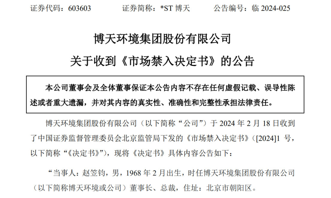 2月19日,博天環(huán)境公告稱,公司于2月18日收到北京證監(jiān)局下發(fā)的《市場禁入決定書》,認定博天環(huán)境2017年、2018年、2019年、2020年、2021年年度報告存在虛假記載,構(gòu)成《證券法》所述的信息披露違法行為。