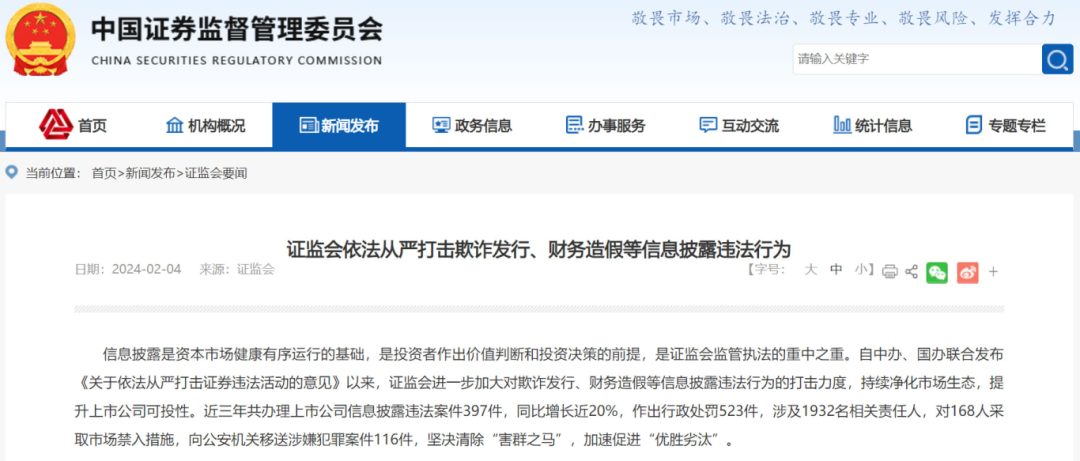 就在上個月,1月7日晚間,興源環(huán)境公告收到《行政處罰決定書》,因全資子公司存在虛增項目收入及成本等情況,導致公司財務數(shù)據(jù)存在虛假記載,興源環(huán)境及公司財務總監(jiān)分別被罰。《行政處罰決定書》顯示,興源環(huán)境的全資子公司——杭州中藝生態(tài)環(huán)境工程有限公司(下稱“中藝生態(tài)”)于2016年、2017年在長興縣美麗城鎮(zhèn)(標段一、標段二)PPP項目、溫州洞頭區(qū)本島海洋生態(tài)廊道整治修復工程PPP項目中存在虛增項目收入及成本等情況,導致興源環(huán)境2016年至2022年年報財務數(shù)據(jù)及相關(guān)披露存在虛假記載。浙江證監(jiān)局決定,對興源環(huán)境責令改正,給予警告,并處以200萬元罰款;對公司財務總監(jiān)孫穎給予警告,并處以80萬元罰款。事實上,興源環(huán)境接受處罰多少有點“冤枉”,因為此次導致處罰的中藝生態(tài)是興源環(huán)境收購而來的,2016年才納入合并報表,當時雙方還簽署了業(yè)績承諾補償協(xié)議。這次虛增項目收入的事件爆發(fā)后,興源環(huán)境也表示,將高度重視業(yè)績承諾補償?shù)淖酚懝ぷ?,擬安排專門隊伍并聘請專業(yè)機構(gòu)進行研判,切實推動相關(guān)工作有效開展。還有此前曾被媒體曝出過“財務造假”的啟迪環(huán)境。2023年9月,湖北證監(jiān)局官網(wǎng)披露,因信息披露違法,對啟迪環(huán)境給予警告并處罰款60萬元,對時任董事長文一波等4位相關(guān)責任人給予警告并處罰款30萬元。調(diào)查顯示,啟迪環(huán)境在2017年-2018年間,通過偽造虛假分包合同及節(jié)點結(jié)算單確認成本,虛構(gòu)了相關(guān)PPP項目(向社會資本開放的基礎設施建設和公共服務項目)合同完工百分比,提前確認或虛假確認總包合同收入,導致啟迪環(huán)境2017、2018年年報中主營業(yè)務收入、主營業(yè)務成本等項目存在虛假記載。2023年7月,龍凈環(huán)保收到中國證監(jiān)會福建監(jiān)管局的行政處罰決定書,認定ST龍凈未按規(guī)定披露關(guān)聯(lián)交易,決定對公司給予警告,并處以一百萬元罰款。還有幾位相關(guān)責任人分別給予了警告和數(shù)額不等的罰款。再往前一個月,2023年6月,美尚生態(tài)也曾收到中國證監(jiān)會的行政處罰決定書,認定美尚生態(tài)2015年公司招股說明書、2015年至2019年年報、2020年半年報、2016年非公開發(fā)行股份及支付現(xiàn)金購買資產(chǎn)并募集配套資金暨關(guān)聯(lián)交易報告書、2017年面向合格投資者公開發(fā)行公司債券募集說明書等信息披露文件存在虛假記載,決定對其責令改正,給予警告,并處以1330萬元罰款。更早以前,卓錦股份于2023年5月,*ST科林于2023年2月,也曾分別收到過證監(jiān)部門的處罰決定書,責令改正,給予警告,并處以一定數(shù)額的罰款。*ST科林的兩位相關(guān)當事人杜簡丞、李根旺還被分別采取了3年證券市場禁入措施。證監(jiān)會嚴打財務造假