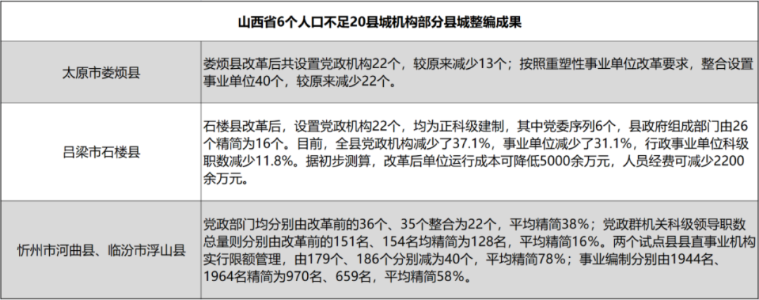 前兩年,安徽、湖南、山西、青海早早就開啟了人口小縣機(jī)構(gòu)編制改革,多個(gè)行政部門被撤,部分事業(yè)單位編制被縮減,有的縣域縮編人數(shù)甚至超過(guò)千人。