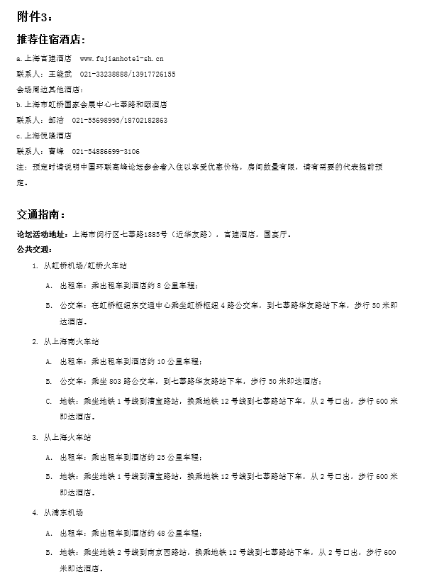 本次論壇注冊(cè)費(fèi)1800元/人(包含會(huì)議當(dāng)天中午用餐、生活垃圾分類、生活垃圾處理行業(yè)、危廢處理行業(yè)、建筑垃圾處理行業(yè)、土壤修復(fù)行業(yè)2017年度發(fā)展報(bào)告共5份及其他會(huì)議材料),中國環(huán)聯(lián)會(huì)員企業(yè)享有免費(fèi)參會(huì)名額(普通會(huì)員單位2名,理事單位3名,常務(wù)理事單位4名,副理事長單位5名)。參會(huì)代表交通及住宿費(fèi)用自理,請(qǐng)自行聯(lián)系推薦住宿酒店預(yù)訂房間(附件3)。請(qǐng)將注冊(cè)費(fèi)匯款到指定賬戶并于2017年12月1日前并發(fā)參會(huì)回執(zhí)(附件2)至?xí)?wù)組郵箱:zghl@envirunion.com。
