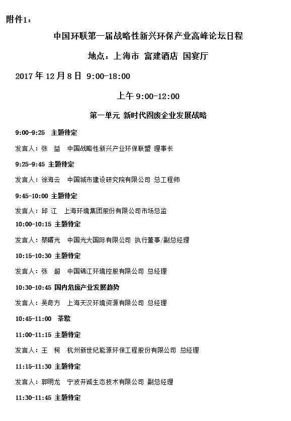 基于以上背景,為加快生活垃圾分類分選科學(xué)長效機(jī)制的建立,深入交流垃圾焚燒先進(jìn)技術(shù),分享水、土、氣污染防治經(jīng)驗(yàn),思考危險(xiǎn)廢物處理處置行業(yè)未來,中國環(huán)聯(lián)擬以“各路精英共謀行業(yè)可持續(xù)發(fā)展”為主題,于2017年12月8日在上海市舉辦第一屆(2017)戰(zhàn)略性新興環(huán)保產(chǎn)業(yè)高峰論壇。屆時(shí),將邀請(qǐng)固廢處理、垃圾分類、水土氣污染防治等領(lǐng)域卓越企業(yè)代表,高等院校資深專家及政府官員參加,解讀環(huán)保政策、分析市場特點(diǎn)、為環(huán)保企業(yè)戰(zhàn)略性發(fā)展及升級(jí)轉(zhuǎn)型出謀劃策,共同為危廢處置、垃圾分類、垃圾焚燒、土壤修復(fù)及水污染防治等環(huán)保細(xì)分行業(yè)的健康發(fā)展探索出一條可持續(xù)的道路。