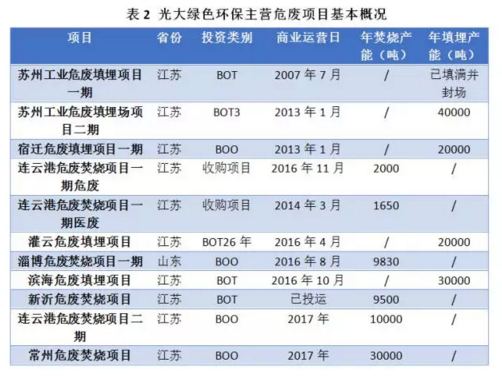 截止2016年末,光大綠色環(huán)保已經(jīng)投運(yùn)項(xiàng)目的產(chǎn)能為13.1萬噸/年(請(qǐng)參考表格內(nèi)容),目前公司在手危廢項(xiàng)目的處置能力合計(jì)高達(dá)50.4萬噸/年,在國內(nèi)危廢處置企業(yè)中排名第三,在華東地區(qū)排名第一,已經(jīng)具備一定規(guī)模優(yōu)勢(shì)。