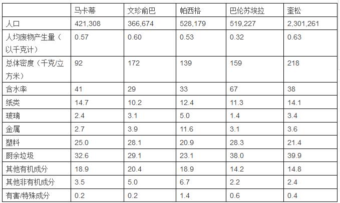 亞洲發(fā)展銀行在2003年對(duì)馬尼拉大都市區(qū)進(jìn)行的調(diào)查,提供了目前僅有的關(guān)于菲律賓廢物組成的信息。調(diào)查收集了馬尼拉都市圈16個(gè)城市中馬卡蒂、文珍俞巴、帕西格、巴倫蘇埃拉、奎松這五座城市的廢物組成信息。