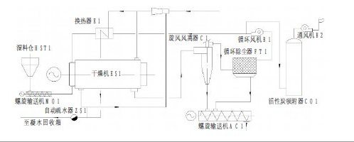 如圖1 ,污泥的蒸汽熱干化技術采用以工 業(yè)蒸汽為干燥介質(zhì),通過污泥干燥機將含水率 為7 0 % 的污泥經(jīng)螺旋輸送機(M01 )送達污泥 干燥機(ES1),來自工業(yè)用中壓蒸汽將乏氣(由 污泥干后形成的廢氣)加熱至110℃,送入干燥 機(E S 1 )的入口,與入口污泥進行混合預熱, 同時,在干燥機(ES1)筒體外殼內(nèi)通入工業(yè)用 中壓蒸汽,作為污泥干燥的主要熱源,采用與 污泥逆流換熱的方式進行熱量傳導,干燥后的 污泥與干燥過程中產(chǎn)生的乏氣一起進入旋風分 離器(C 1 ),其中9 5 % 以上的干燥污泥在旋風 分離器(C 1 )中被分離,另外5 % 的污泥與乏 氣在布袋除塵器(F T 1 )中被收集,并共同進 入螺旋輸送AC1 輸送出系統(tǒng);被分離出的乏氣, 一部分(約20%)進入下一輪污泥干燥循環(huán),另 一部分(約80%)通過活性炭吸附器(CO1)除臭后排入大氣。