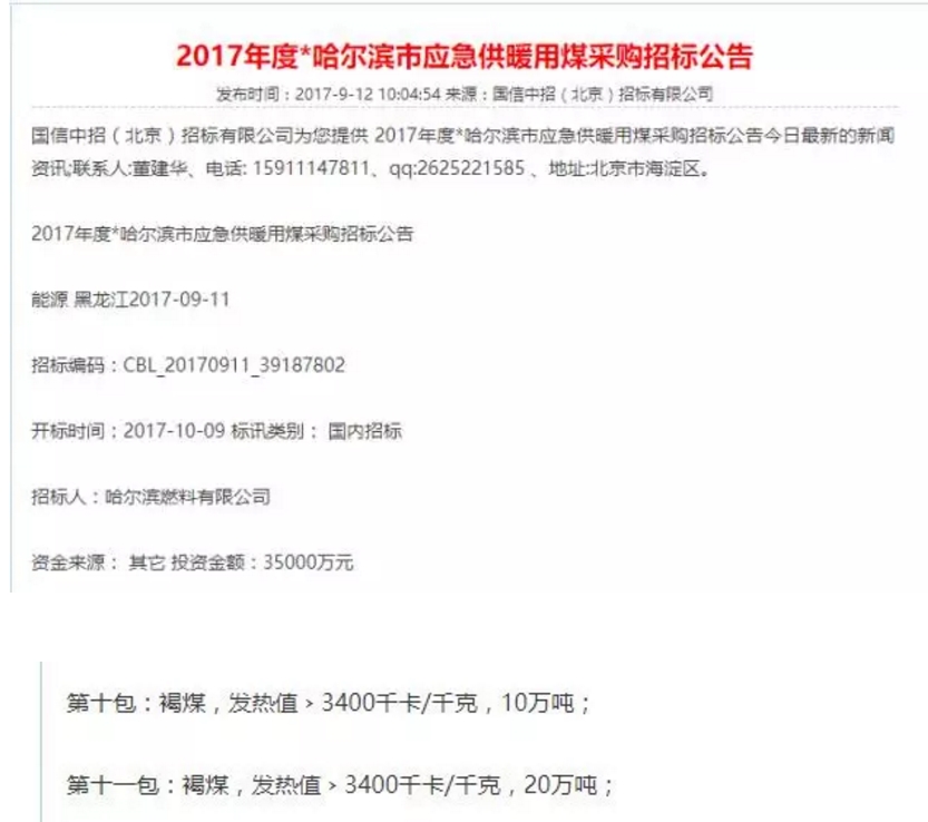 而記者在中國(guó)化工產(chǎn)品網(wǎng)上看到,哈爾濱燃料有限公司于今年9月12日發(fā)布了哈市應(yīng)急供暖用煤采購(gòu)招標(biāo)公告,其中共計(jì)30萬(wàn)噸褐煤僅要求發(fā)熱值大于3400千卡/千克。在企業(yè)注冊(cè)信息上,該公司經(jīng)營(yíng)范圍包括煤炭批發(fā)經(jīng)營(yíng)。