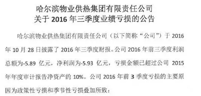2016年前三季度,哈爾濱物業(yè)供熱集團(tuán)有限公司虧損5.89億元,虧損金額超過(guò)其2015年年度審計(jì)報(bào)告凈資產(chǎn)的10%。該公司曾披露,在供熱質(zhì)量和環(huán)保排放質(zhì)量提升的情況下,熱費(fèi)價(jià)格卻隨煤炭?jī)r(jià)格走低而下調(diào),政策性虧損為其2016年前三季度虧損主要原因。