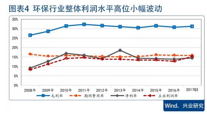 行業(yè)利潤水平高位穩(wěn)定。2017年前三季度環(huán)保行業(yè)整體毛利率為31.27%,同比小幅下降0.41個百分點;凈利率為14.51%,同比下降0.1個百分點。雖然非環(huán)保企業(yè)逐步開展環(huán)保類業(yè)務后,行業(yè)競爭情況有所加劇,但由于行業(yè)空間足夠大、子行業(yè)較多以及特許經(jīng)營制度,企業(yè)間競爭呈現(xiàn)一定差異化特征,因此行業(yè)毛利率和凈利率均能保持高位穩(wěn)定狀態(tài)。