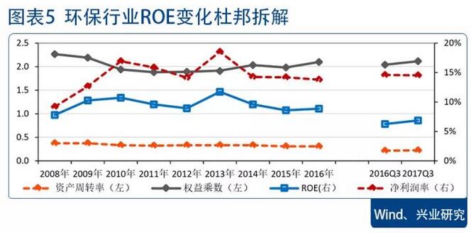 權益乘數(shù)抬升下,行業(yè)整體盈利能力小幅上升。2017年前三季度環(huán)保行業(yè)整體ROE為6.86%,同比增加0.61個百分點。通過杜邦分析來看,行業(yè)凈利率和資產(chǎn)周轉率整體保持穩(wěn)定,盈利能力的提升主要來自權益乘數(shù)的上升,隨著行業(yè)訂單的逐步釋放和PPP類訂單的增加,環(huán)保企業(yè)融資需求有所提升。