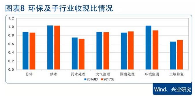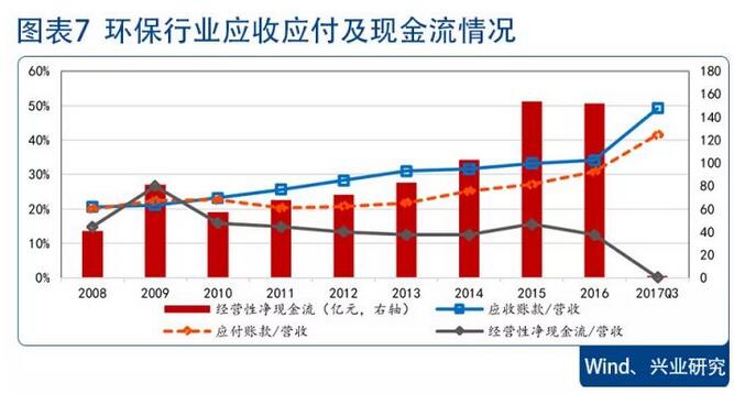 行業(yè)經(jīng)營性現(xiàn)金流仍然較弱。環(huán)保行業(yè)2017年三季度經(jīng)營性現(xiàn)金凈流量為1.45億元,同比下降95.46%,同時,行業(yè)應收賬款持續(xù)增長,2017年前三季度為499億元,占營業(yè)收入比例升至49.2%的歷史高點。行業(yè)前三季度經(jīng)營性現(xiàn)金流偏弱主要有四個原因:一、行業(yè)現(xiàn)金流呈現(xiàn)季節(jié)性特征,四季度回款一般會變好;二、設備制造類企業(yè)由于原材料大幅漲價導致購買商品支付的現(xiàn)金大幅增加(科林環(huán)境、龍凈環(huán)保、菲達環(huán)保);三、部分污水處理企業(yè)承接的PPP項目增多,導致支付工程款、保證金及為業(yè)主墊款情況增加(碧水源、興源環(huán)境);四、個別企業(yè)票據(jù)業(yè)務結算情況增加,導致現(xiàn)金收入減少(盈峰環(huán)境)。