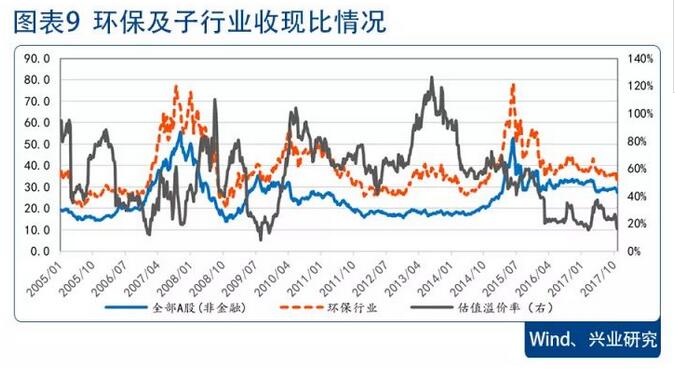 從行業(yè)估值及對全部A股(非金融)的溢價率上看,目前環(huán)保行業(yè)整體估值水平處于歷史偏低位置,估值溢價率也是近幾年低點,截至2017年11月3日,環(huán)保行業(yè)整體PE(歷史TTM整體法,剔除負值)是31.72,估值溢價率為16.15%。